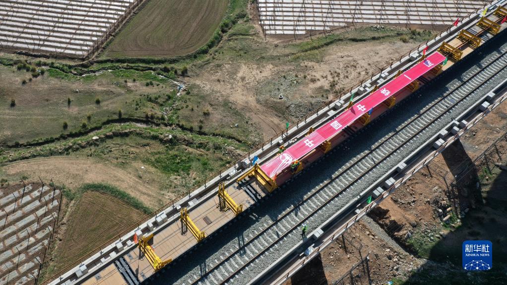 這是5月26日拍攝的中鐵一局蘭張三四線鐵路下河?xùn)|特大橋鋪軌作業(yè)現(xiàn)場(無人機(jī)照片)。新華社記者 陳斌 攝