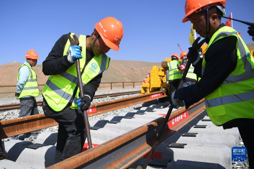 5月26日,中鐵一局施工人員在蘭張三四線鐵路下河?xùn)|特大橋鋪軌施工現(xiàn)場作業(yè)。新華社記者 陳斌 攝