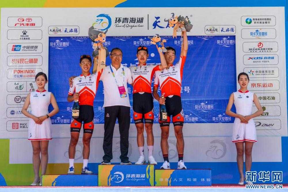 運動員手拿吉祥物站在環(huán)湖賽領獎臺。環(huán)湖賽組委會供圖。