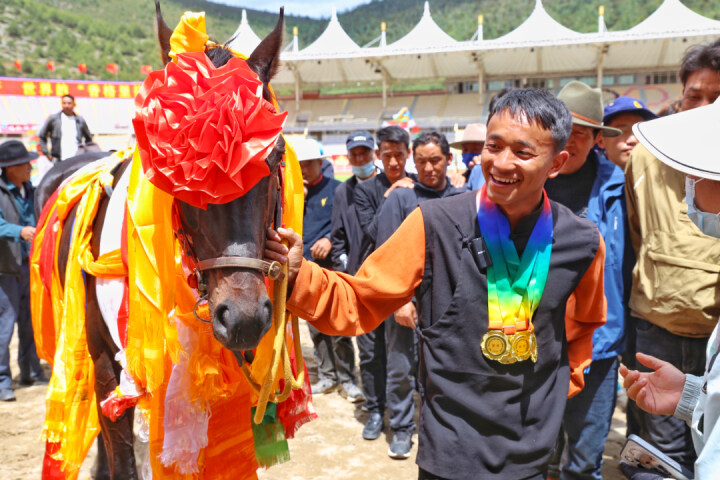 三天來,香格里拉五鳳山賽馬場內(nèi)人頭攢動(dòng),熱鬧非凡,州內(nèi)各族群眾和游客從四面八方聚集而來,為三年未能出現(xiàn)在香格里拉端午賽馬現(xiàn)場的駿馬和騎手們搖旗吶喊、加油助威,而來自州內(nèi)及友鄰州市的各代表隊(duì)則不負(fù)眾望,為大家呈現(xiàn)了一場場熱血沸騰的高水平馬術(shù)競技?!拔覐?5歲開始參加比賽,今年是收獲最大的一次,連獲了4枚金牌,我很高興,期待明年的端午節(jié)能再次與來自不同地方的選手切磋。”23歲的知詩定主說道。此次,他獲得了甲組1000米走馬、甲組3000米走馬、乙組3000米走馬、丙組1000米走馬賽冠軍。與他并駕齊驅(qū)的嘎提七林則在甲組5000米速度賽、丙組5000米速度賽、甲組3000米速度賽、乙組3000米速度賽中獲得金牌。