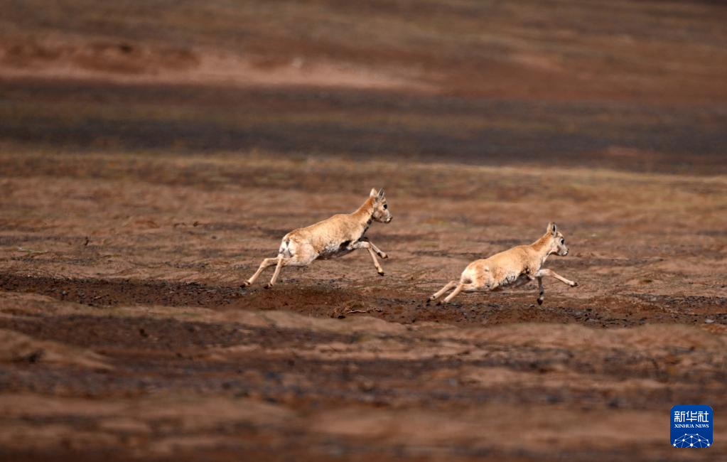 兩只藏羚羊在可可西里卓乃湖區(qū)域活動(6月17日攝)。新華社記者 張宏祥 攝