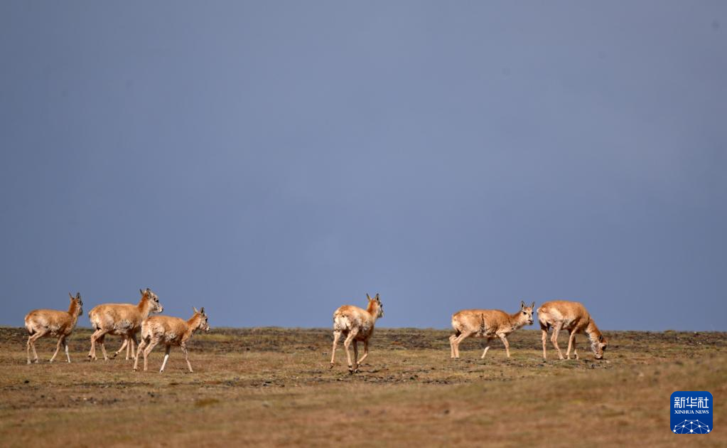 一群藏羚羊在可可西里卓乃湖區(qū)域活動(6月18日攝)。新華社記者 張宏祥 攝