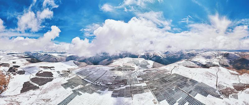 距兩河口水電站約50公里的柯拉一期光伏電站,200多萬塊光伏板將最高海拔4600米的扎拉托桑山裝點成一片“光伏?!?。