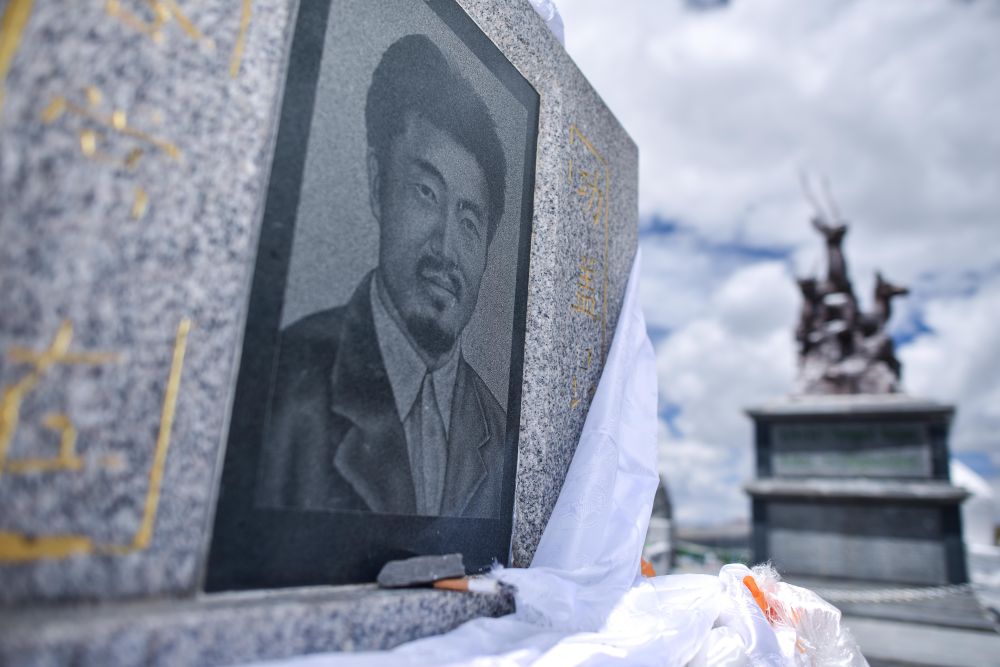 這座石碑鐫刻著杰?!に髂线_(dá)杰的名字。20多年前,為了保護(hù)瀕危的藏羚羊,他與盜獵分子槍戰(zhàn)到生命最后一刻,遺體被凍結(jié)成冰雕。