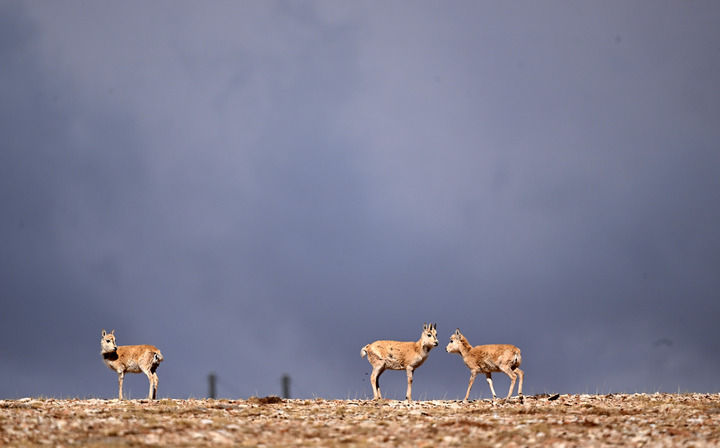 三只藏羚羊在三江源地區(qū)活動(5月28日攝)。新華社記者 張宏祥 攝