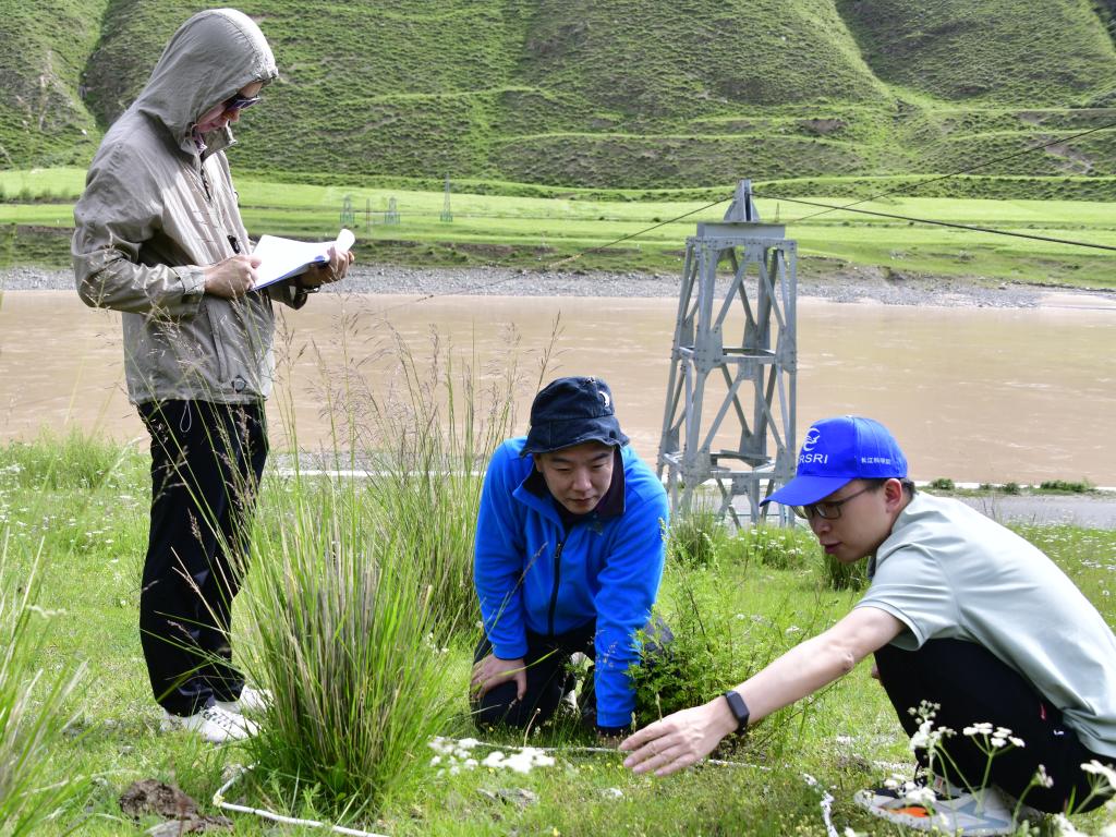 這是2023年江源綜合科考隊員任斐鵬(中)、李昊(左)、嚴(yán)智偉在長江源區(qū)的通天河直門達(dá)河段開展植被樣方調(diào)查。新華社記者李勁峰 攝