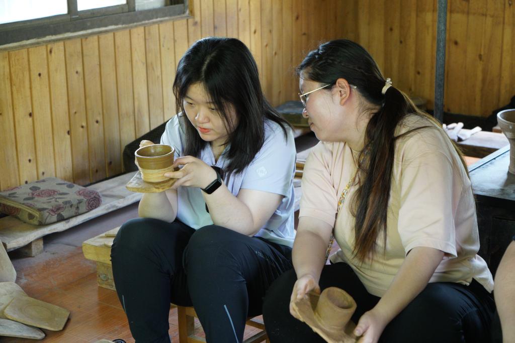 “啪、啪、啪……”清脆而富有節(jié)奏的拍打聲此起彼伏,不斷響起。一群游客圍坐一圈,專心致志地聽(tīng)著講解。他們左手勻速轉(zhuǎn)動(dòng)底部輪盤,右手持木板輕輕拍打。不一會(huì)兒,每個(gè)人面前的杯狀陶坯都已初步成型。