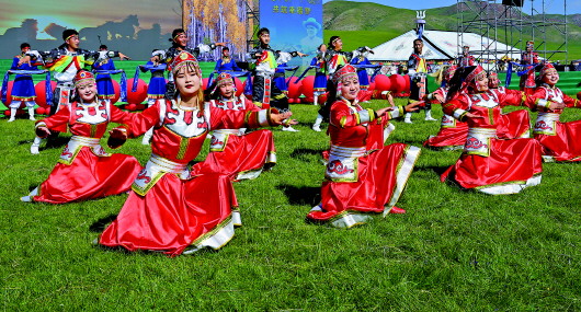 背靠同寶山,面朝青海湖,身著盛裝的當(dāng)?shù)馗髯迦罕姾褪苎钨e歡聚在鮮花盛開的金銀灘草原,在湖光山色中共享視聽盛宴。