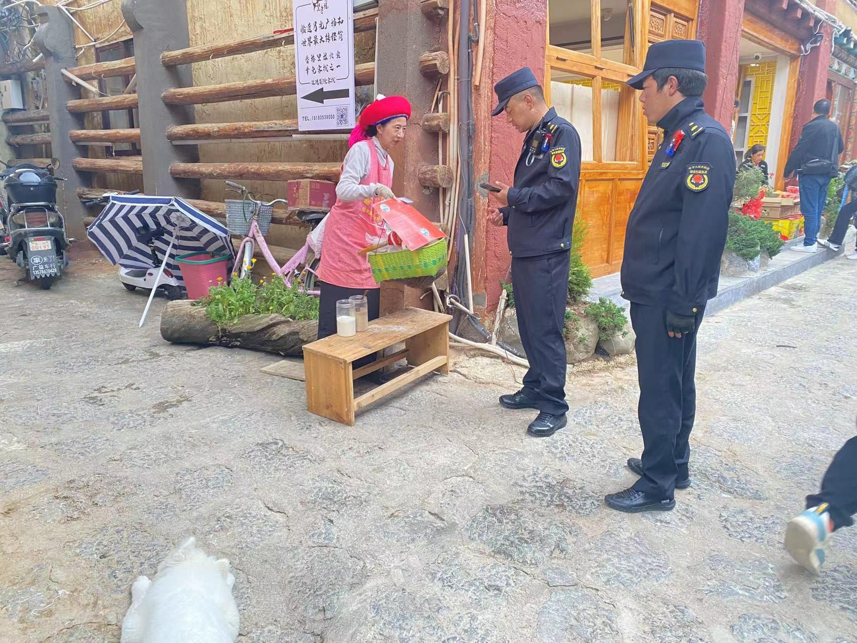 整治過程中,綜合行政執(zhí)法人員全天候無縫巡查,重點(diǎn)對出店經(jīng)營、占道經(jīng)營、亂停亂放、流動攤販無序擺攤等問題進(jìn)行整治。排查月光廣場等公共區(qū)域擺攤?cè)藛T,凡屬古城內(nèi)商戶的一律要求返回店內(nèi)買賣;屬于流動攤販的及時(shí)引導(dǎo)至劃定的攤位;對古城內(nèi)所有亂停亂放的機(jī)動車和非機(jī)動車,及時(shí)找到使用人,要求停放至指定區(qū)域,確保游客出行更加方便,市容更加整潔有序。圖為綜合行政執(zhí)法人員在勸導(dǎo)占道經(jīng)營攤點(diǎn)。