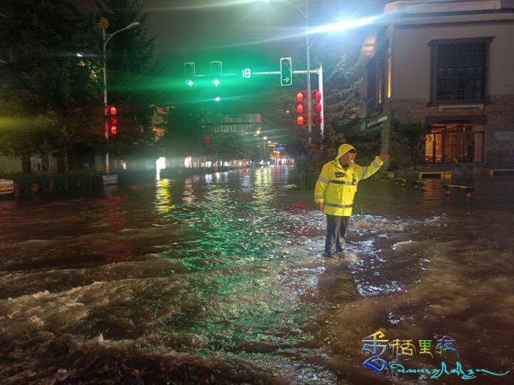 8月6日,受強降雨影響,香格里拉市城區(qū)部分路段出現(xiàn)不同程度的內(nèi)澇和雨水倒灌現(xiàn)象。香格里拉市城區(qū)陽塘路、壇城北路、池慈卡街等道路嚴重積水,出行受阻,隱患增多。為保障群眾安全出行,香格里拉市公安局直屬城市交警大隊第一時間啟動防汛應(yīng)急預案,全力開展交通疏導、隱患排查,通宵達旦排水排澇、搶險清障、救助群眾,扛起保障道路安全暢通的重擔,為市民雨夜出行撐起“安全傘”。