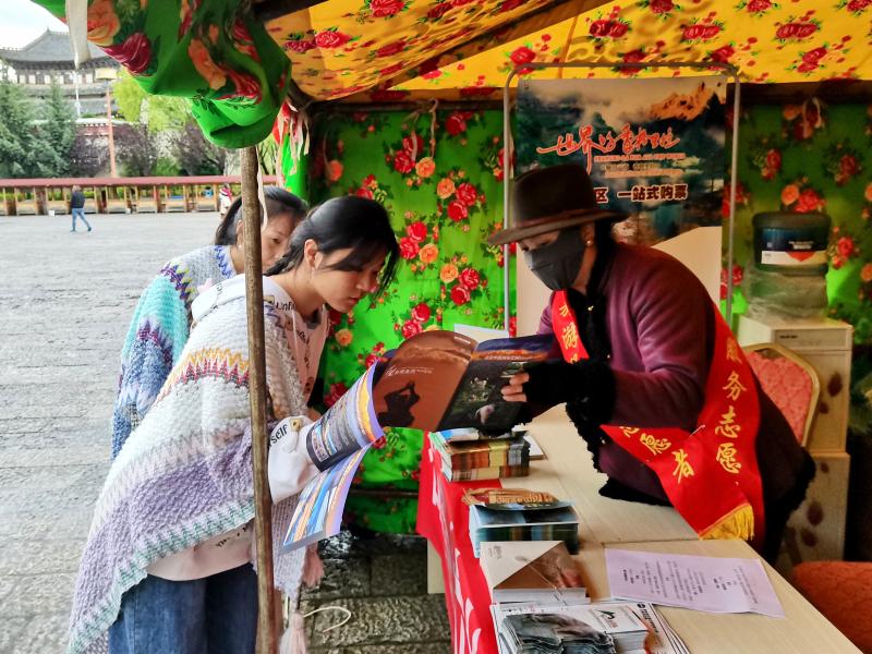 在服務(wù)點(diǎn),游客可以獲取香格里拉各旅游景點(diǎn)、旅游路線和當(dāng)下活動(dòng)的信息介紹,以及景區(qū)門票預(yù)訂指引,還可隨意取閱各類旅游宣傳手冊(cè)、旅游地圖和旅游書籍等。來自廣州的游客李先生通過服務(wù)點(diǎn)志愿者的指引到古城旅游服務(wù)中心購(gòu)買了至普達(dá)措景區(qū)的直通車票和景區(qū)門票?!爸安惶私?,到這兒?jiǎn)柫藛柌胖?,可以直接搭乘景區(qū)大巴車到普達(dá)措,這樣方便了不少?!崩钕壬f。