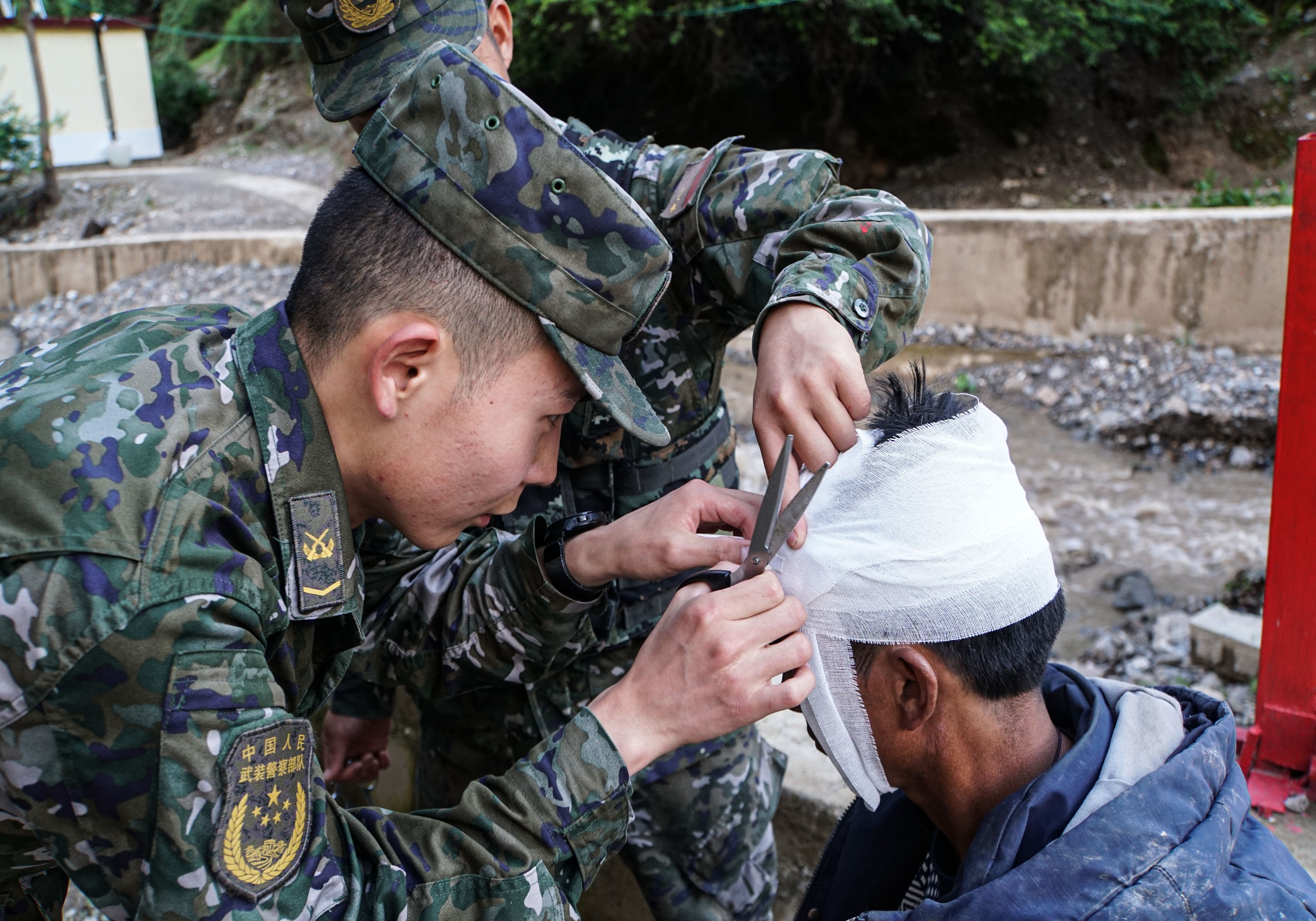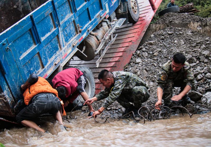 “同志,不要怕,我們是武警官兵,我們先給你處理傷口。” 甕云飛一邊安撫受傷群眾的情緒,一邊為他消毒止血、包扎傷口。后經(jīng)檢查,該群眾除了頭部有輕微皮外傷外,全身并無(wú)大礙。之后,中隊(duì)官兵又和當(dāng)?shù)厝罕娨黄鹜度胲囕v緊急救援,經(jīng)過(guò)幾個(gè)小時(shí)的努力,大家齊心協(xié)力將貨車拖至安全地帶。
