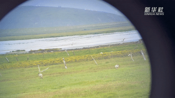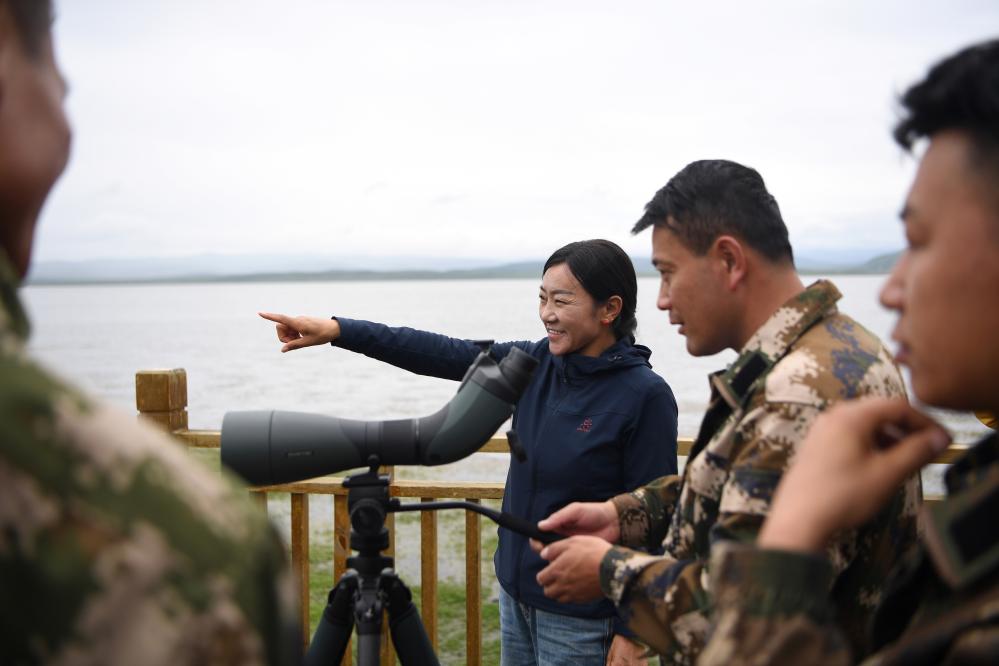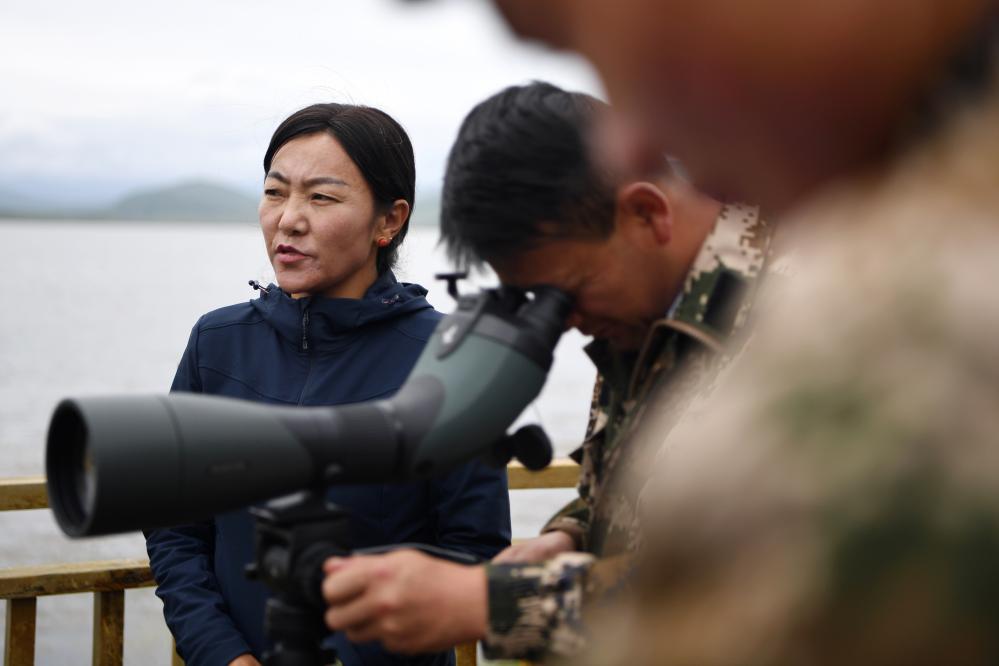 甘肅尕海則岔國家級自然保護區(qū)管護中心尕海保護站站長香毛吉(左一)和同事在保護區(qū)內(nèi)用望遠鏡觀測野生動物。 新華社記者 陳斌 攝