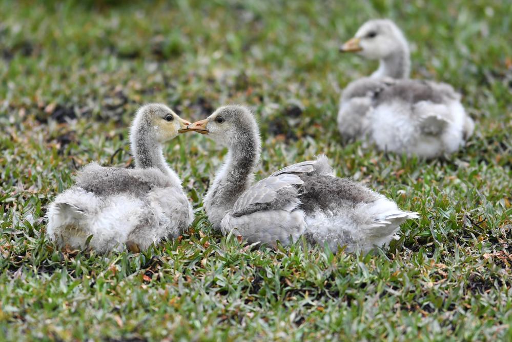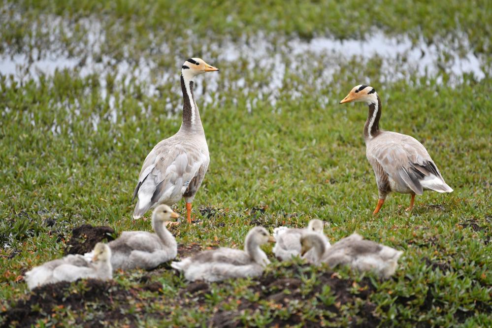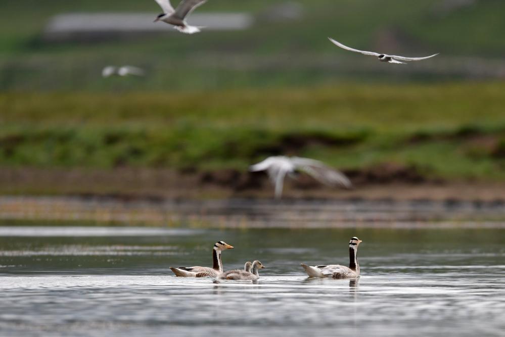斑頭雁幼鳥在甘肅尕海則岔國家級自然保護區(qū)的尕海濕地嬉戲。 新華社記者 陳斌 攝