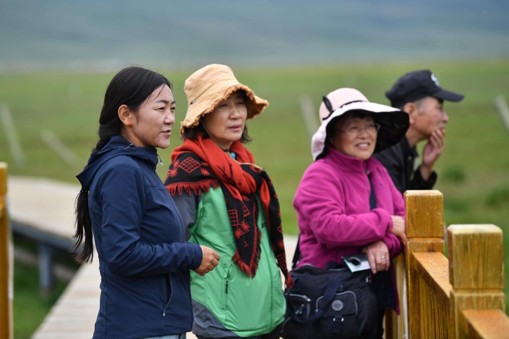 甘肅尕海則岔國家級自然保護區(qū)管護中心尕海保護站站長香毛吉(左一)向游客介紹保護區(qū)的野生動植物情況。 新華社記者 陳斌 攝