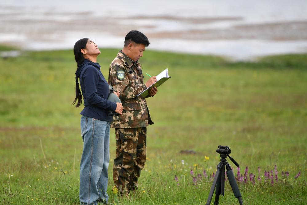 甘肅尕海則岔國家級自然保護區(qū)管護中心尕海保護站站長香毛吉(左)和同事在巡護過程中做記錄。 新華社記者 方欣 攝