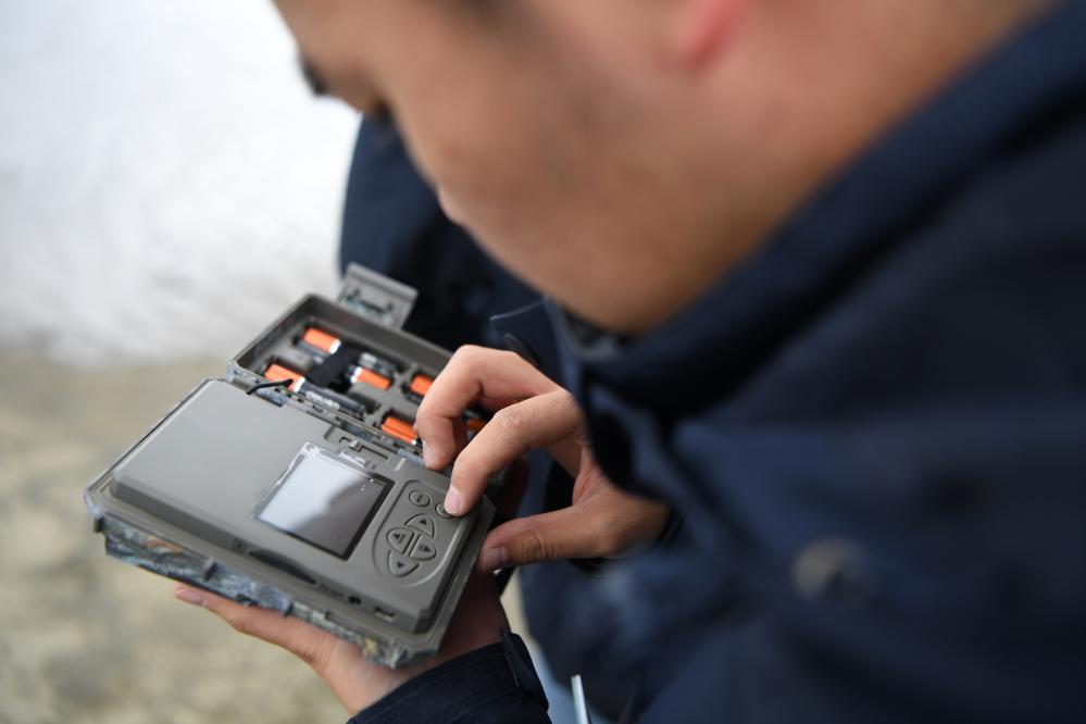 甘肅黃河首曲國家級自然保護區(qū)管護中心曼日瑪保護站的工作人員在保護區(qū)內(nèi)檢查紅外相機的工作情況。 新華社記者 方欣 攝
