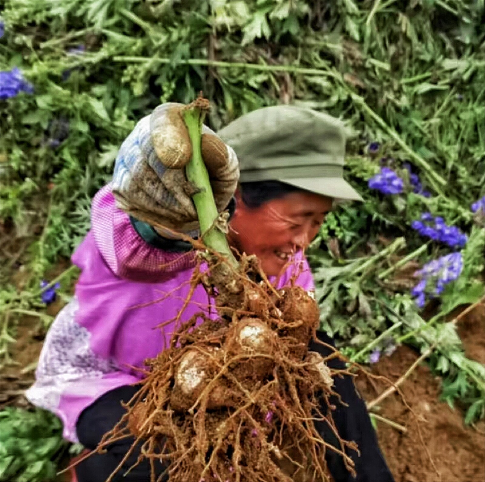 近日,維西傈僳族自治縣攀天閣鄉(xiāng)美洛村400余畝附子喜獲豐收。田間地頭,村民們?nèi)宄扇海f(xié)作,將一顆顆采挖出來的附子收集成籮,集裝成袋,看著眼前的一袋袋附子,村民們都樂得合不攏嘴?!敖衲旮阶赢a(chǎn)量很高呢,按照去年的市場價今年一畝最多可有2萬收入”美洛村副主任和麗新說。