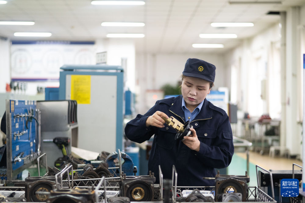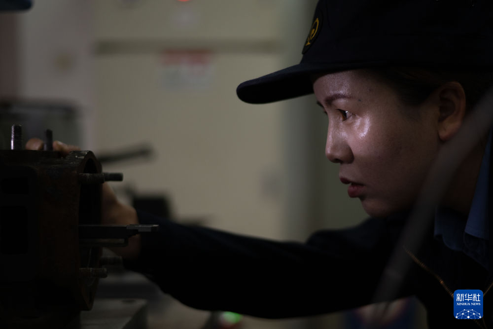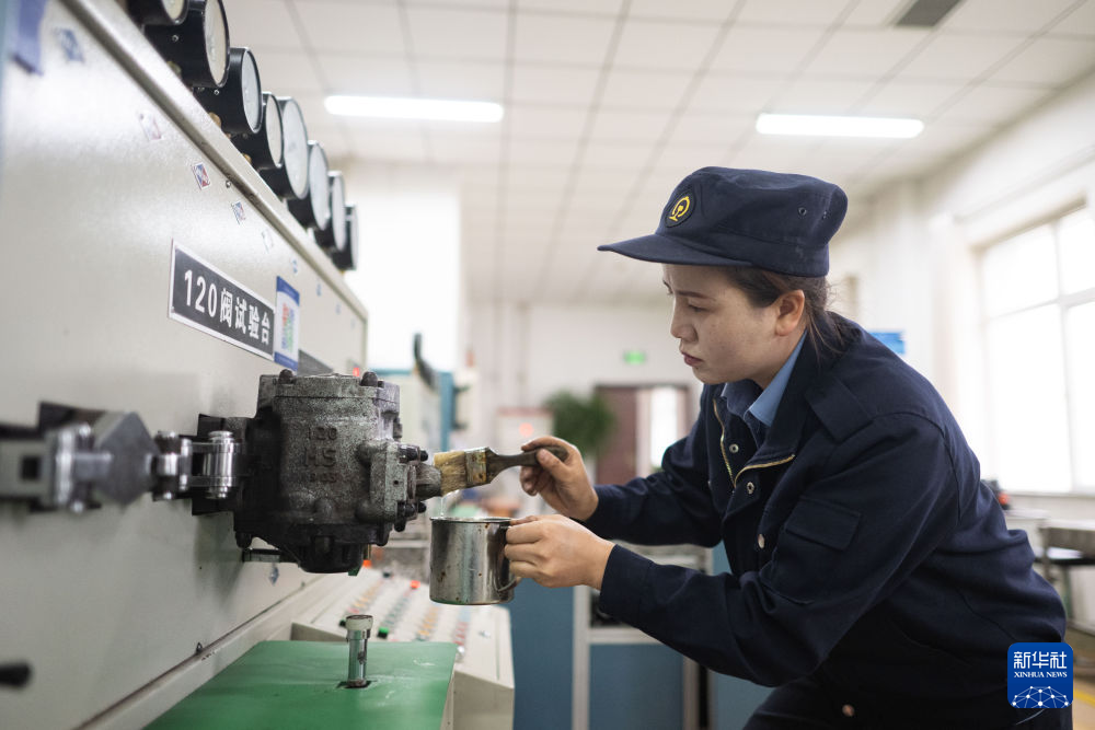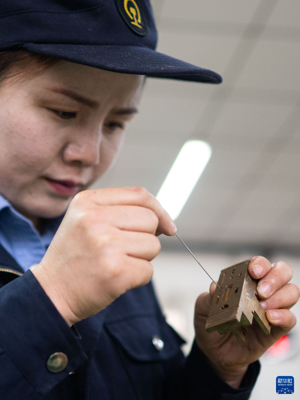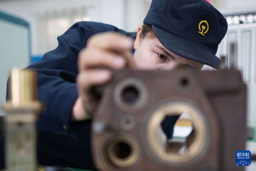 10月12日,在中國鐵路青藏集團有限公司西寧東車輛段制動班組,馬婷對120閥滑閥內部通路進行疏通。新華社記者 張龍 攝