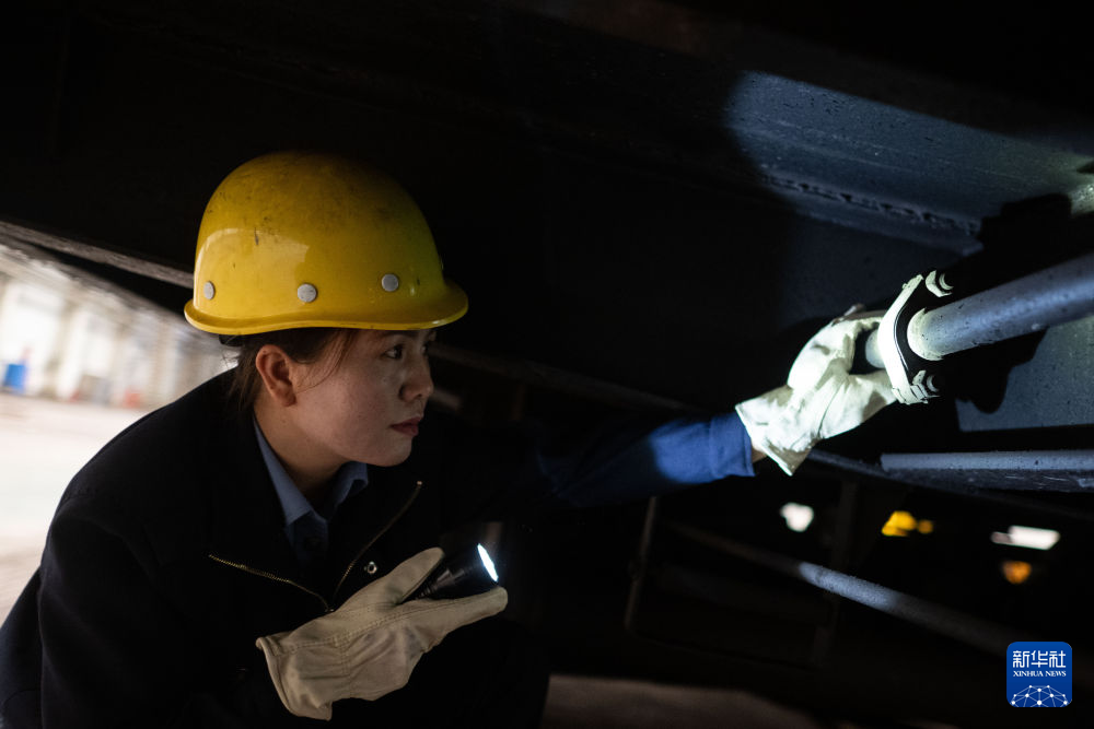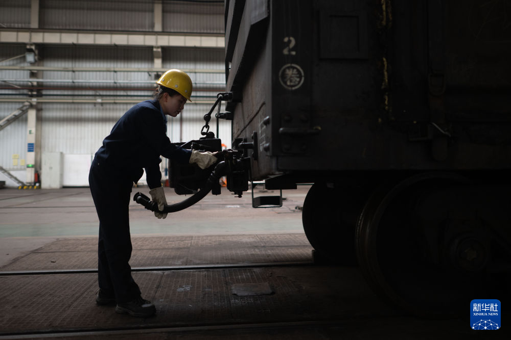 10月12日,在中國鐵路青藏集團有限公司西寧東車輛段制動班組,馬婷在檢查貨車車輛制動軟管。新華社記者 張龍 攝