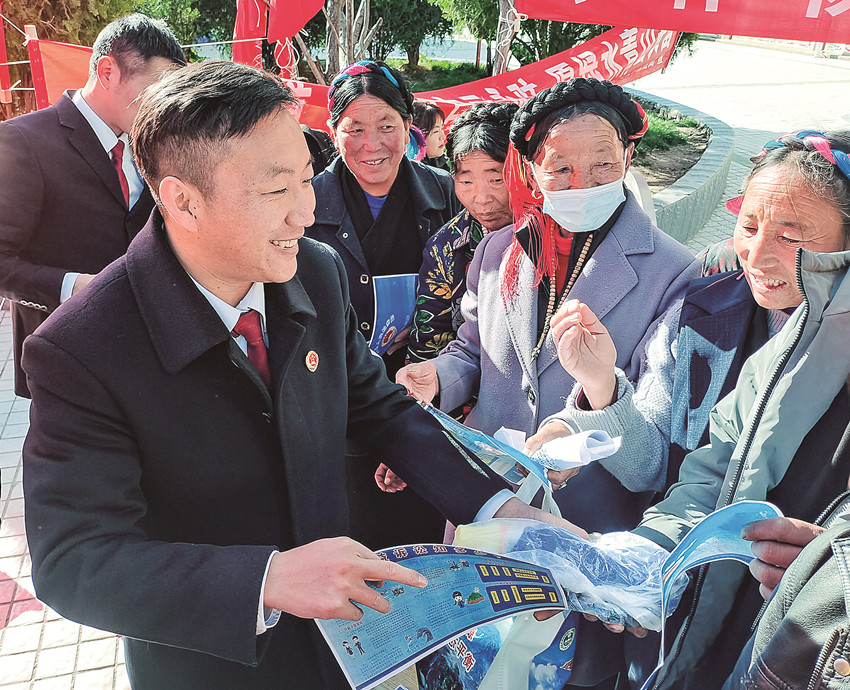 得榮縣檢察院檢察官倪華忠(左一)向群眾們開展普法宣傳。