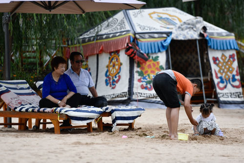游客在尖扎縣昂拉鄉(xiāng)德吉村黃河露天沙灘上游玩(2020年8月11日攝)。新華社記者 張龍 攝