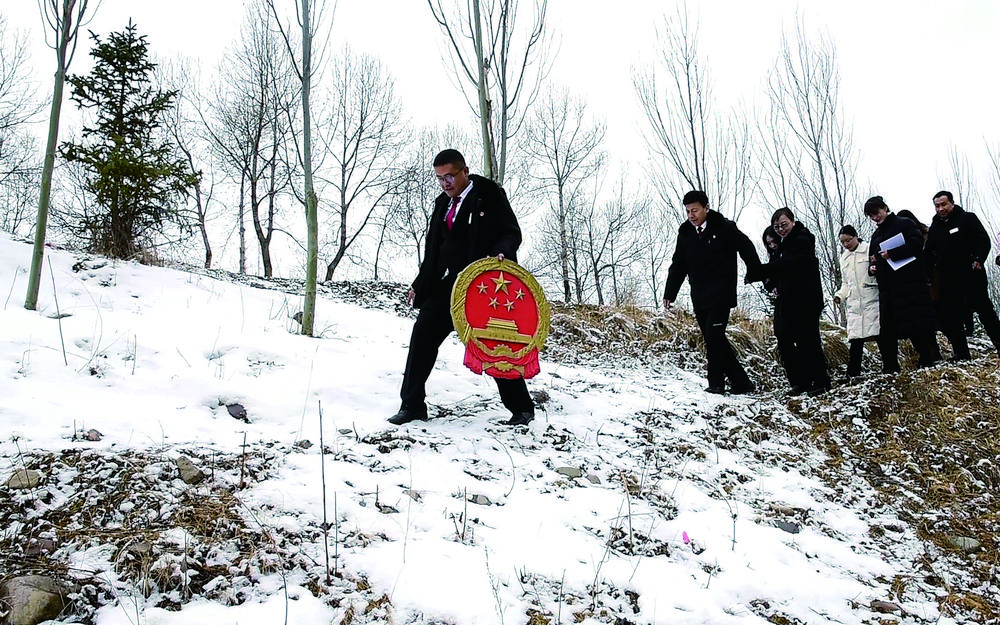 互助土族自治縣人民法院家事審判團(tuán)隊法官迎著漫天的飛雪,手捧國徽,入村開展巡回審判。省高級人民法院供圖