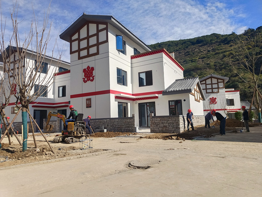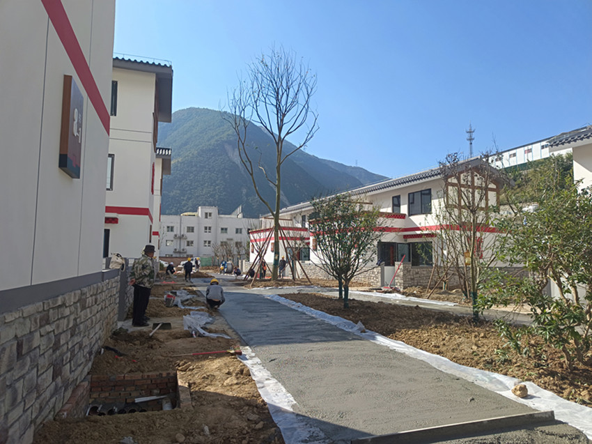 11月5日,記者走進瀘定縣德威鎮(zhèn)奎武村“9·5”瀘定地震災后重建集中安置點,只見一幢幢繪有“如意結”和穿斗裝飾等瀘定傳統(tǒng)建筑元素以及“瀘定紅”“紅飄帶”等民族特色的安置房沿大渡河畔依次排開,一條條寬敞平整的水泥硬化道路將這些風貌一致、戶型合理、結構安全的安置房屋串聯(lián)起來。幾十名工人正在安置點內忙碌,有的在鋪設路面、有的在栽種綠化樹、有的在搬運廢渣……,拿到鑰匙的部分村民正在進行室內裝修,現(xiàn)場一派繁忙景象。