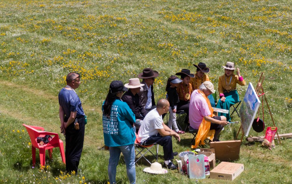 2021年7月22日,在道孚縣玉科大草原,一名畫家在花海里創(chuàng)作油畫,吸引了當(dāng)?shù)啬撩窈陀慰蛧^。新華社記者 江宏景 攝
