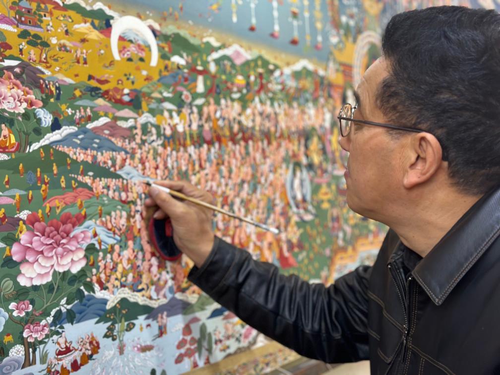 筆在不到1厘米的菩薩臉上劃過,輕得不見著色,幾筆過后,一個(gè)由棕漸變到淡黃的下頜線漸漸出現(xiàn)了。這張長約3.5米、高近2米的畫布上分布著2023位人物,最小不及一粒青稞,60歲的非遺傳承人曲久已經(jīng)畫了3年,還要一年多才能完成。