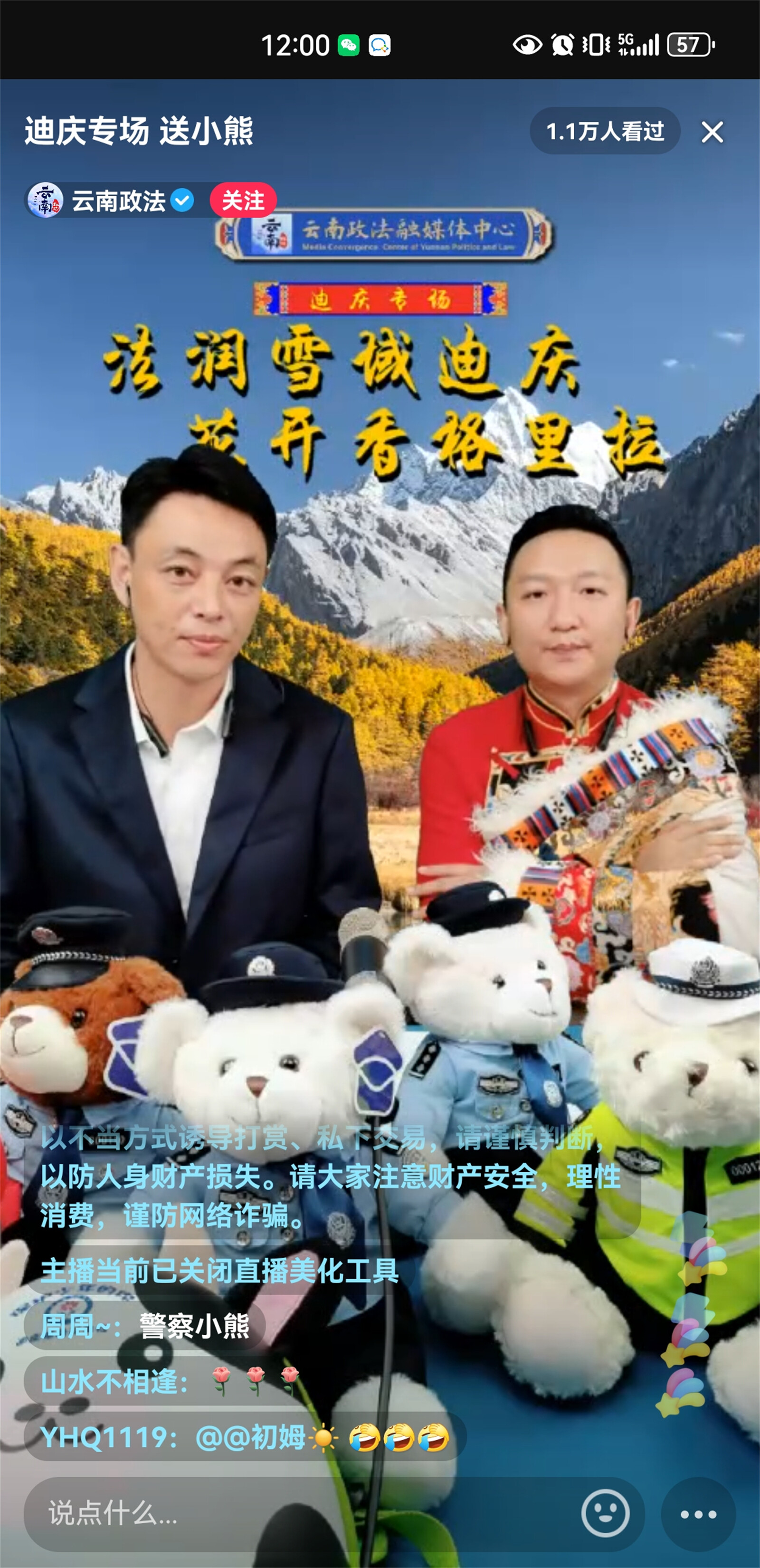 近日,迪慶州政法干警走進(jìn)云南政法普法強(qiáng)基直播間開(kāi)展“法潤(rùn)雪域迪慶、花開(kāi)香格里拉”迪慶州普法專場(chǎng)直播,直播聚焦群眾關(guān)切,緊密聯(lián)系時(shí)事熱點(diǎn),帶廣大網(wǎng)友體驗(yàn)了一場(chǎng)內(nèi)容豐富的普法之旅,共吸引9.1萬(wàn)人觀看,獲點(diǎn)贊超10.4萬(wàn)。
