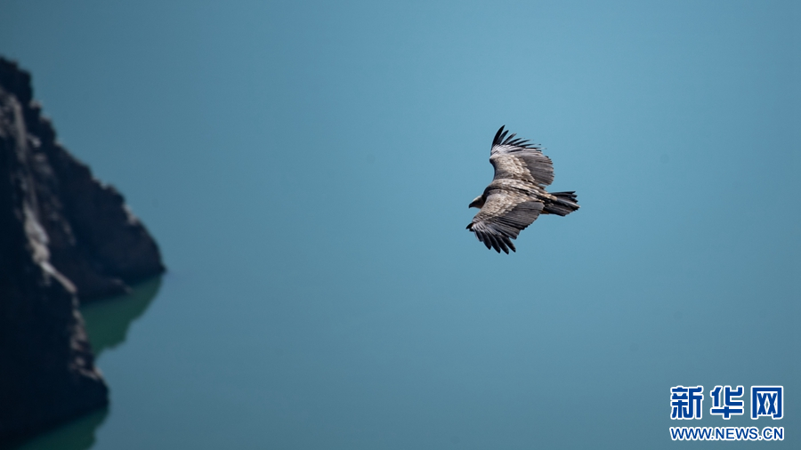 龍羊大峽谷內,一只兀鷲飛過。新華網 潘彬彬 攝