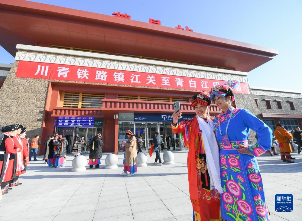 11月28日,在川青鐵路茂縣站,當(dāng)?shù)馗髯迦罕娫谡厩皬V場慶祝鐵路開通運(yùn)營。新華社記者 王曦 攝