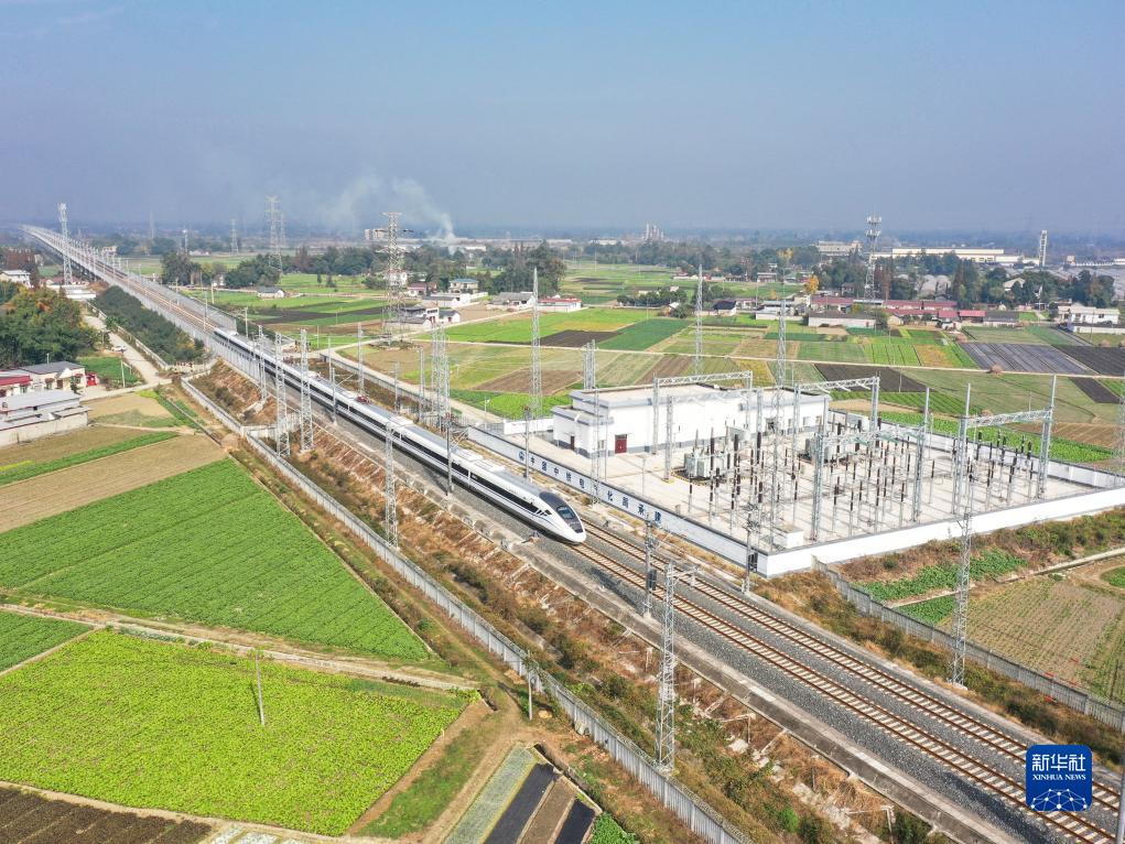11月28日,首發(fā)列車C6008次列車行駛在川青鐵路上,該段與成萬高速并行、與成都都市圈環(huán)線高速交會(huì)(無人機(jī)照片)。新華社記者 江宏景 攝
