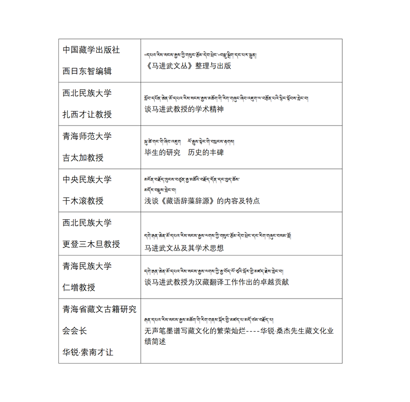 中國藏學(xué)研究中心原副總干事洛桑靈智多杰,青海省省志辦原總編、藏文古籍研究會(huì)名譽(yù)會(huì)長謝佐,西北民族大學(xué)科研處副處長英加布,甘肅省藏學(xué)研究學(xué)會(huì)副會(huì)長傅千吉,宗拉昌瓦公司總經(jīng)理扎西加等專家學(xué)者對(duì)《馬進(jìn)武文叢》的學(xué)術(shù)水平和現(xiàn)實(shí)意義給予了高度評(píng)價(jià),認(rèn)為該系列叢書不僅體現(xiàn)并傳承了馬進(jìn)武先生的學(xué)術(shù)思想,而且在推動(dòng)新時(shí)代藏語文研究和藏漢翻譯事業(yè)發(fā)展、促進(jìn)學(xué)術(shù)合作,推動(dòng)民族語言學(xué)學(xué)科繁榮和進(jìn)步等方面,具有高度的學(xué)術(shù)性和現(xiàn)實(shí)意義。西藏自治區(qū)藏醫(yī)院副院長銀巴研究員、四川民族出版社社長澤仁扎西、青海師范大學(xué)原副校長扎布教授、夏壩·嘉央克珠、甘肅華銳剛乃旦才讓、青海民族大學(xué)旦正教授、青海民族出版社副社長阿寧·扎西東主等對(duì)《馬進(jìn)武文叢》的出版發(fā)行表示祝賀。