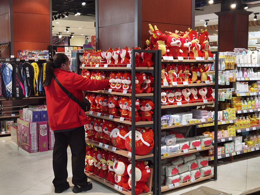 農(nóng)貿(mào)市場一片火熱景象,而在各大超市里,各種龍年喜慶元素的年貨擺在貨架最顯眼的位置,增添了不少節(jié)日氛圍。顧客以年輕人居多,購物車里包裝精美的各類產(chǎn)品琳瑯滿目。
