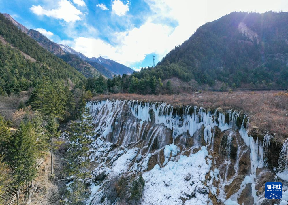 這是1月4日在四川省九寨溝風(fēng)景名勝區(qū)拍攝的諾日朗瀑布形成的冰瀑景觀(無人機照片)。新華社記者 王曦 攝