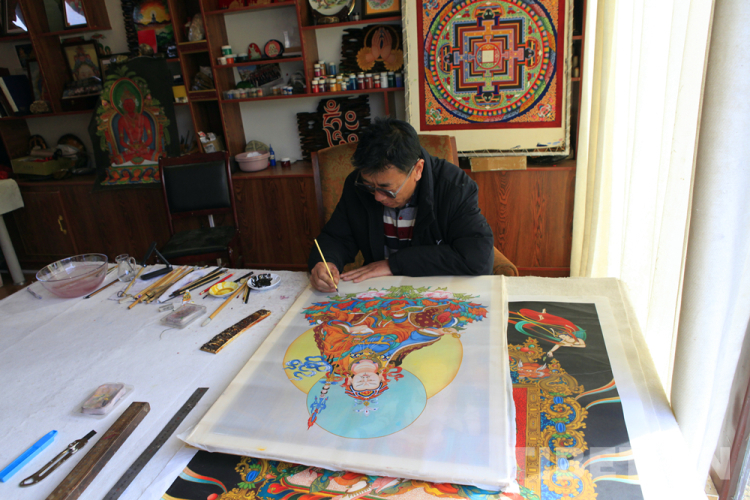 科考隊(duì)對(duì)玉科鎮(zhèn)的歷史街巷、傳統(tǒng)民居,進(jìn)行了系統(tǒng)的勘測(cè)和記錄。并對(duì)玉科鄉(xiāng)村遺產(chǎn)中活態(tài)延續(xù)的非物質(zhì)文化技藝與人居環(huán)境的共生關(guān)系,進(jìn)行了系統(tǒng)的走訪調(diào)研。在返鄉(xiāng)畫師、州級(jí)非物質(zhì)文化傳承人呷瓦家中,科考隊(duì)看到了繪制在絲絹上的唐卡。呷瓦早先曾在北京游藝,深受當(dāng)?shù)匚幕绊?,后因家鄉(xiāng)的鄉(xiāng)村文旅發(fā)展火熱,就帶著滿心的故土鄉(xiāng)愁回到家鄉(xiāng)授徒創(chuàng)業(yè)。在家鄉(xiāng),呷瓦把藏族傳統(tǒng)唐卡繪畫與中國(guó)傳統(tǒng)的水墨畫相融合,首創(chuàng)了這樣創(chuàng)新的畫法。