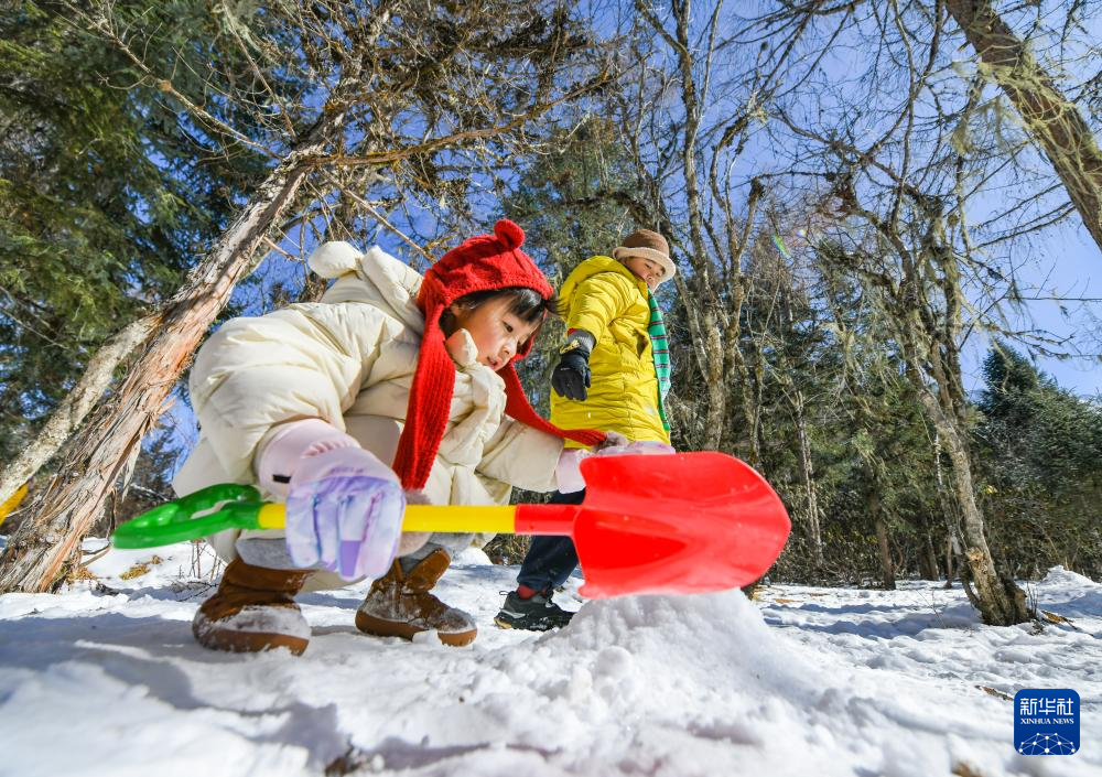 1月25日,小游客在畢棚溝風(fēng)景區(qū)堆雪人。新華社記者 王曦 攝
