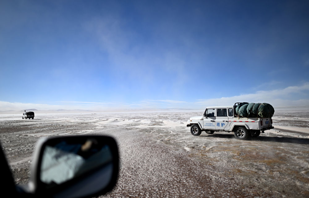 記者看到,當?shù)仫L雪不斷、飛沙走石,道路顛簸曲折。巡山隊員驅車從可可西里索南達杰保護站出發(fā),途經卓乃湖、可考湖等地,對沿線地區(qū)開展常態(tài)化巡檢。隨行車輛配備了帳篷、睡袋、自熱食品等生活物資和必要的急救物資。巡山隊員白天鑿冰取水,晚上則要住在野外的帳篷里。