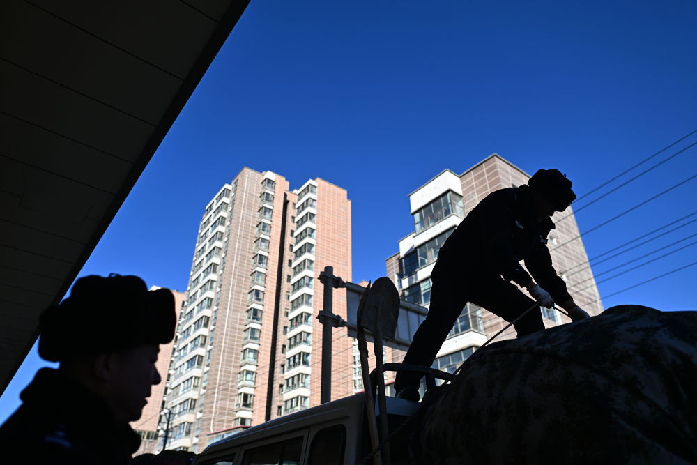 在青海省海西蒙古族藏族自治州格爾木市,可可西里森林公安局兩名巡山隊(duì)員正在裝車(chē)(1月18日攝)。新華社記者 張宏祥 攝