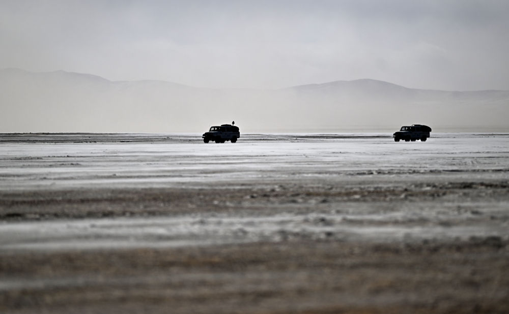可可西里森林公安局巡山車(chē)輛在可可西里卓乃湖區(qū)域附近巡查途中(1月19日攝)。新華社記者 張宏祥 攝