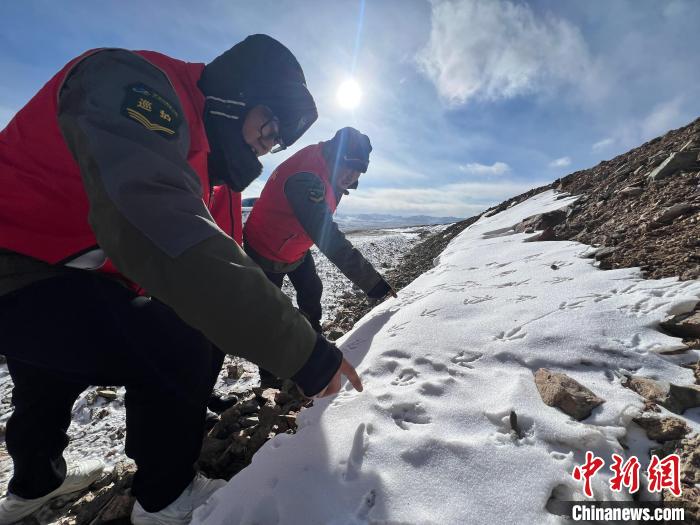 1月24日,管護(hù)員在巡護(hù)路上發(fā)現(xiàn)野生動(dòng)物留下的腳印。中新社記者 李江寧 攝