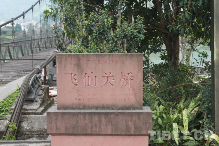 站在橋邊,遙望蜿蜒的江水就是青衣江,飛仙關橋全長164米,寬4.5米,索塔為鋼筋混凝土門式框架,高29米,流動式索鞍,策略式索錠,當時的設計載重為15噸。橋柱橫額上有時任西南軍政委員會主席劉伯承所題寫的橋名——“飛仙關橋”。橋西岸塔柱有時任十八軍政委譚冠三題寫的檻聯(lián)——“發(fā)揮天才,發(fā)揮力量,戰(zhàn)勝困難,創(chuàng)造人民幸福,一面進軍,一面建設解放西藏,鞏固西南國防”的字樣。東岸塔柱上有時任西康省主席廖志高題寫的檻聯(lián)——“勞動創(chuàng)造世界飛仙天險何難克服,革命帶來幸福閉塞邊區(qū)從此繁榮”字樣。橋上五顆閃閃的紅星,映照著飛仙關的繁榮,也印證著革命前輩們的美好愿景已經(jīng)變?yōu)楝F(xiàn)實。