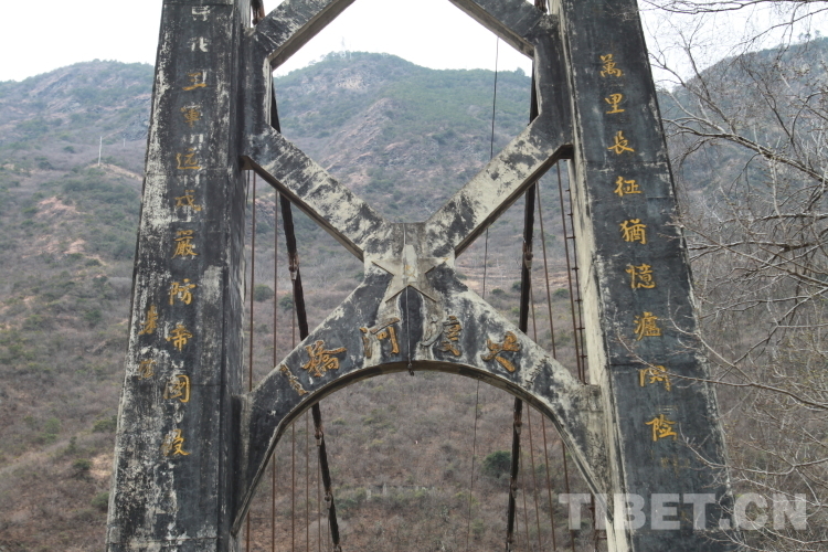 不難看出,大渡河橋至今保存完整。東橋塔上清晰可見劉伯承同志當(dāng)年揮筆寫下的“大渡河橋”幾個大字,揮筆毫末間仍然能感受到當(dāng)年建橋完成的喜悅激動之情。橋的兩側(cè)是朱德總司令親筆為該橋題寫的橋聯(lián):“萬里長征猶憶瀘關(guān)險(xiǎn),三軍遠(yuǎn)戍嚴(yán)防帝國侵”。因位置限制,西橋塔暫時(shí)無法親眼目睹,據(jù)瀘定縣文物考古研究所副所長葉丹介紹,西橋塔上有廖志高同志為該橋題寫的橋聯(lián):“河水南流任澎湃波濤難阻當(dāng)年紅軍奮勇前進(jìn)創(chuàng)造光輝記錄完成長征奠下了勝利基礎(chǔ);旌旗西指看神勇大軍全掃康藏殘敵努力建設(shè)力求民族幸福實(shí)現(xiàn)團(tuán)結(jié)組織友愛家庭”。