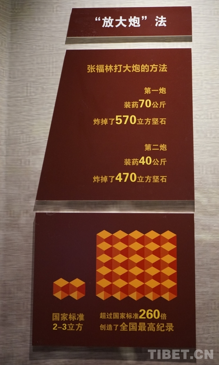 在雀兒山修路時(shí),張福林白天與戰(zhàn)友們懸在巖壁上打炮眼,晚上到工地上研究堅(jiān)石、孤石、松石、片石等各種石頭的打眼、裝藥、放炮等技術(shù),并積極向工程人員、技工同志、工兵部隊(duì)學(xué)習(xí),最終提出了改進(jìn)裝藥的方法,即“放大炮法”。“放大炮法”的爆破功效超國家標(biāo)準(zhǔn)260倍,創(chuàng)造了全國爆破的最高紀(jì)錄。這一方法不僅能提高工效,還能節(jié)約炸藥,在筑路部隊(duì)中得到全線推廣,張福林也被大家譽(yù)為“大炮手”。