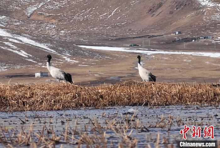 25日,今年首批黑頸鶴如約來到青海玉樹藏族自治州隆寶灘國際重要濕地。