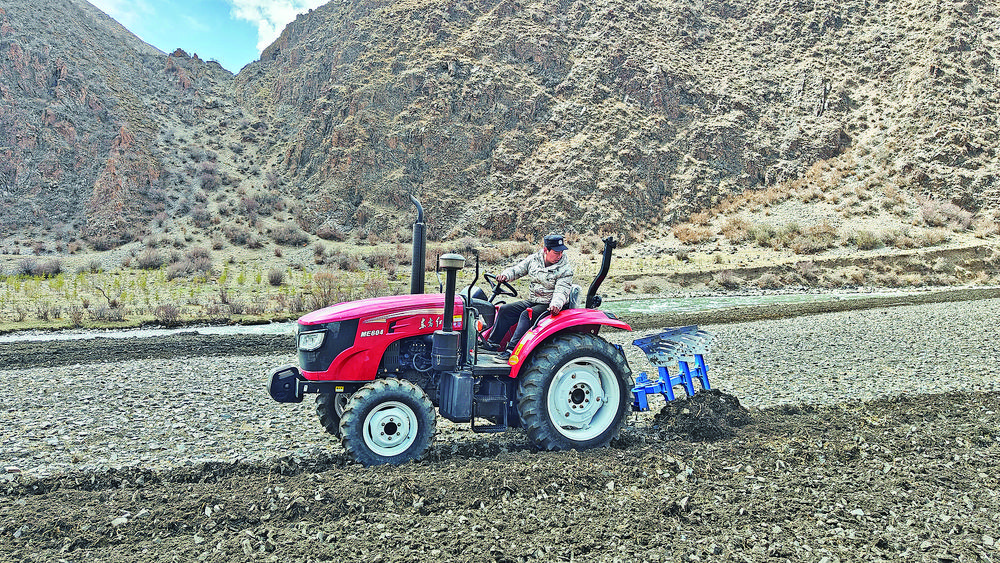 進(jìn)村時(shí)還在飄雪的結(jié)拉村,下午放晴了。跟隨駐村工作隊(duì)的腳步,我們來(lái)到結(jié)拉村的春耕現(xiàn)場(chǎng),三輛拖拉機(jī)正在有序犁地,已經(jīng)犁過(guò)的地里,大家在有序地撒種?!叭豪镎f(shuō)今天開始春耕了,我正好有時(shí)間就過(guò)來(lái)了,我們?nèi)膫€(gè)人輪流開,今天得犁30多畝地?!闭f(shuō)著話,鬧布達(dá)杰的同伴接過(guò)了他的車?yán)^續(xù)作業(yè)?!按遄永锏那鄩涯昊径紩?huì)開,誰(shuí)有時(shí)間誰(shuí)就過(guò)來(lái)。種地時(shí),大家都不會(huì)偷懶,四五天時(shí)間,村子里的1500多畝地也就種完了?!濒[布達(dá)杰說(shuō)。