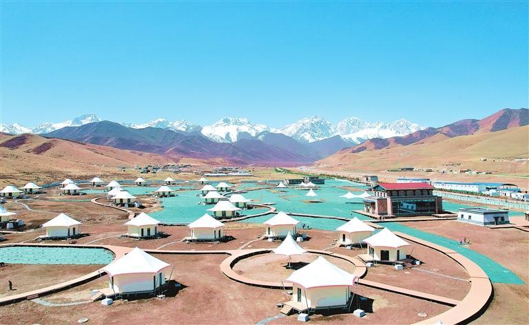 藍天白云、雪山皚皚,俯瞰天??h抓喜秀龍旅游基礎設施建設項目現(xiàn)場,蜿蜒曲折的木棧道如花莖延伸,一座座白頂帳篷外形的民宿似雪蓮綻放,幾十名工人爭分奪秒搶抓工期,為項目完工做最后沖刺。