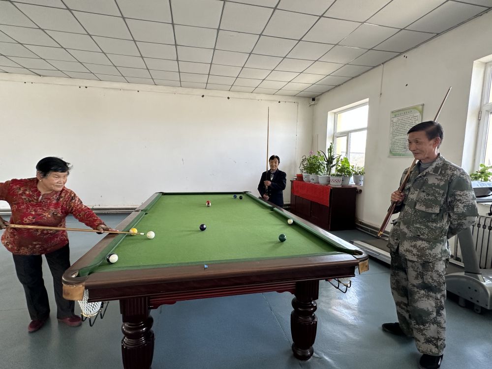 “在這兒吃住免費,飯有人做,衣服有人洗,每月還有100多元的養(yǎng)老金和零花錢。”在活動室里,王金蓮手握臺球桿,熟練推桿。入住敬老院后,運動成了她的生活日常。